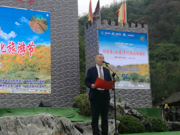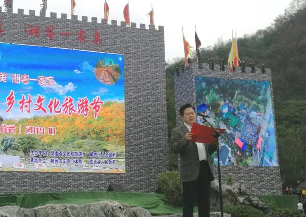 “锦绣潇湘·别样郴州·玉见临武”。10月24日上午,2019年湖南省(秋季)乡村文化旅游节在临武县秦汉古道溱水关文化广场开幕,湖南省政协副主席、郴州市委书记、市人大常委会主任易鹏飞宣布开幕。郴州市委副书记、市长刘志仁、湖南省文旅厅副厅长高扬先分别致辞,郴州市委副书记邹文辉主持开幕式,临武县委书记李浩致欢迎辞。