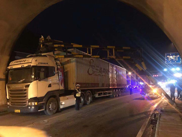 到达现场后,只见一辆重型货车因高度超标,车头后部被卡在限高架下动弹不得,此次撞击导致限高架左右两侧钢管弯曲,阻挡了另一边的道路口,像一个巨大的塞子。此时,正值晚高峰时段,加上事发路段为主干道路,为了不耽误群众下班回家时间,两名骑警立即报告指挥中心,迅速联系施救吊车赶往现场,同时附近增援警力也及时赶到现场,采取封路措施,并引导隧道内车辆分流绕行。与此同时,一中队警力和2台施救吊车也一同到达现场,展开救援。救援过程随着不断降温的天气越来越艰难,吉首交警持续守护现场、指挥交通、参与救援,用坚守和担当对抗着寒冷的天气。