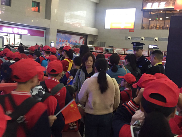 11月1日,怀化市某小学600余名六年级学生准备在怀化南站乘车前往长沙开展研学活动。面对学生人数众多,年纪尚小,随行老师又少的情况,怀化南所强化候车室、站台等人员密集区域的治安盯控与秩序维护,设置专人进行引导进站乘车,同时,在进站口等显眼位置布置1-2名警力作为报警求助点,现场服务师生群众,积极解答各类疑问,提升乘车师生的安全感。