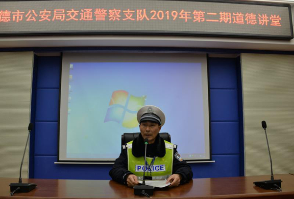 12月24日下午,“全国最美基层民警”、“湖南文明交通好交警”、常德市公安局交警支队直属四大队民警曾祥富坐客市交警支队2019年第二期道德讲堂,讲叙他的最美故事,在警营传递正能量。交警支队机关各部门、城区直属各大队民警代表参加活动。