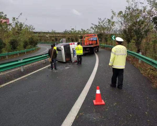 路政队员迅速展开救援工作,在事故后方做好摆放锥筒等安全措施,并配合交警疏导交通,维护现场通行秩序。同时,通知施救站前来施救,对事故现场进行勘察,经路政队员详细了解,因车主车速过快,加上雨天路面湿滑在转弯的时候猛踩了急刹车,才导致了面包车的侧翻。