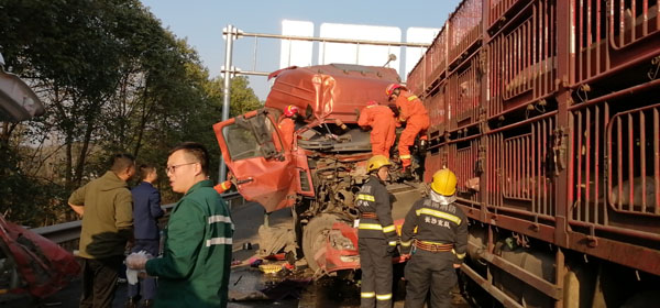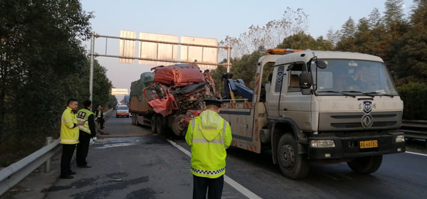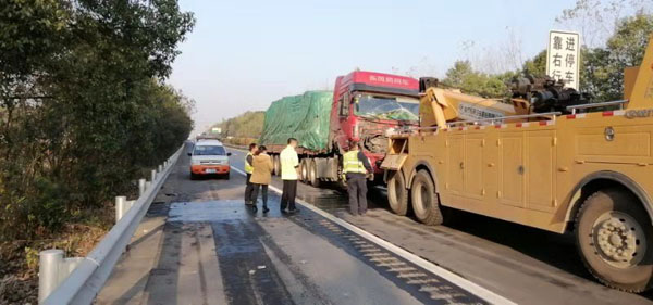 15时50分,到达事故现场。一台运输装备的货车与一台运输生猪的货车发生追尾,直接影响后方车辆通行。见其中一辆货车驾驶室严重变形,司机被困无法动弹,大队领导立即与交警、消防、急救、施救现场负责人成立现场指挥部,按各自职责,迅速调度人员展开救援。长沙东大队兵分两路,一路安排施救人员快速用安全锥设置作业安全区域,维护现场安全,防止二次事故发生。另一路协助消防、急救人员对被困司机进行救援。同时将现场情况向管理处监控分中心报告,为科学分流滞留车辆提供即时路况信息,确保辖区不发生长时间大面积交通拥堵和车辆滞留。
