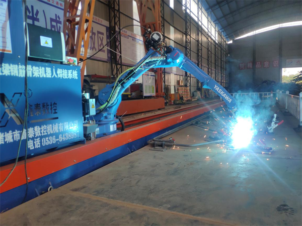平益高速第三合同段钢筋加工班组技术负责人胡启辉介绍项目上的焊接机器人:“‘质量保证、高效率和安全环保’是这台机器最大的优势。相较工人流水线焊接作业,运行10万次误差仅为0.8mm,可以24小时连续作业,效率是人工焊接的10倍左右。而且可以避免人工焊接产生的粉尘、弧光等对人体可能造成的伤害,非常安全环保。”