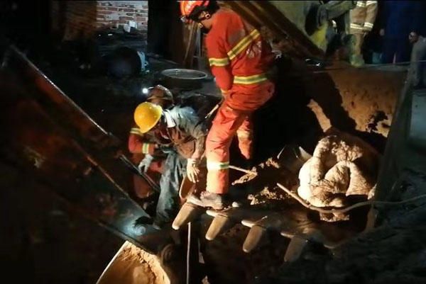 由于井内结构倾斜、地基松软,随时都有可能再次垮塌,长时间救援被困者体力透支严重,营救工作困难重重。20时16分,救援指挥部研究决定采取兵分三路、攻坚施救。第一组固定好牵引绳,防止被困人员下坠,等时机成熟,迅速收紧绳索上拉救援人员。第二组救援人员站在挖掘机斗内观察被困工人情况,稳定其情绪。同时利于塑料桶、绳索配合井下被困者往井上方向清云泥土、砂石。第三组在水井下方开展救援工作,井下方救援工作进展非常艰难,非常危险,救援人员几次险些被井上面松落的砖块砸中。由于作业面下狭小,在利用挖掘机斗作为安全掩护,救援人员紧爬在地上,轮番上阵采用小锄头、小铲子和双手刨的方式将压在被困工人身下位置的沙土一点一点往外清出。