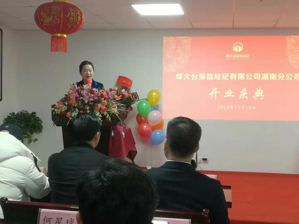 12月28日,烽火台保险经纪有限公司湖南分公司开业典礼暨揭牌仪式在长沙市举行。湖南省城乡统筹发展中心主任蒋良初,湖南省慈善总会副会长倪继周,省人民政府参事室研究员曾昭才,湖南省教育系统副厅级干部李建国,省军区原副参谋长邳俊山先生,湖南省城乡集团董事长吴海兰女士,烽火台保险经有限纪公司副总经理尤茂林,湖南省保险行业协会副秘书长毛小娟等出席活动。 参加本次开业典礼的嘉宾还有:中国平安财产保险股份有限公司湖南分公司交通运输部、中国人民财产保险股份有限公司湖南省分公司财产船货保险部,中国太平洋财产保险股份有限公司长沙中心支公司等保险公司代表; 活动现场气氛隆重热烈。
