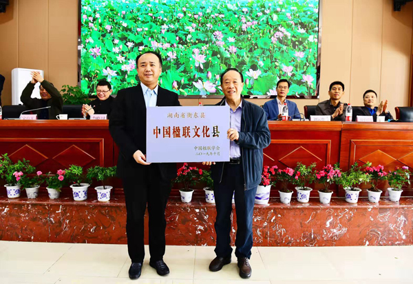 “中国楹联文化县”由中国楹联学会命名挂牌,是一座城市历史底蕴、文化品位、文明程度等方面软实力的综合体现。近年来,衡东十分重视楹联文化等优秀传统文化的传承和发展,把创建中国楹联文化县与推进社会主义精神文明创建活动相结合,成立了专门的创建工作领导小组,开展了一系列创建活动,在全县范围内营造了浓厚的创建氛围。全县楹联组织健全,会员发展迅速,楹联创作、吟咏活动蓬勃开展。目前,全县有超过1000人从事楹联创作,其中国级楹联学会会员31人,省级楹联学会会员25人、市级楹联学会会员31人,先后编辑出版《中国对联集成湖南省衡东分卷》、《衡东楹联年鉴》、《衡东诗联书画》1—22期,有50余名会员出版了诗词楹联专集,楹联文化氛围浓厚。