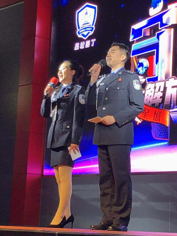 19时30分,《野狼disco》串烧热舞打开了仪式序幕。主持人陈慧、谢理首先向观众介绍了《守护解放西》的拍摄经过、“解放西”和坡子街派出所的基本情况以及“互联网+群防群治”巡逻防控的相关内容。接着,张鹏、易点等8位明星警官逐一走上舞台与粉丝见面,在互动中,警员们用或幽默风趣,或恳切耐心的回答,回应了现场粉丝和网友的提问,现场气氛达到了高潮。