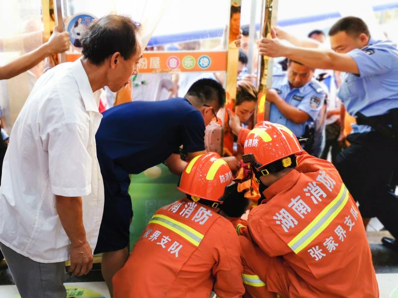 9月13日下午3点30分,张家界市桑植县消防救援大队接到报警,在桑植县梅尼超市附近的一家店门口,一名小男孩头部被玻璃门卡住无法脱身。消防员到场时发现小孩脖子被卡在两扇玻璃门缝中间,小孩母亲用手一直死死抱住小孩不敢放手。消防员经过观察,发现卡住小孩头部的玻璃门装卸螺丝已经生锈,不能正常卸下,而此时一但大门再次转动,会夹住小孩的脖子,危及生命安全。此时,家长非常着急,孩子也十分急躁不安,情况紧急,不容耽误。消防员决定通过液压扩张器对两扇门进行扩张施救。为防止操作过程中玻璃门的玻璃碎片落下对小孩造成二次伤害,消防员一边用毛巾衣服等物将孩子头部保护住,一边安抚家长和孩子的情绪。经过紧张小心施救,3点57分,小孩成功脱险,并无受伤。