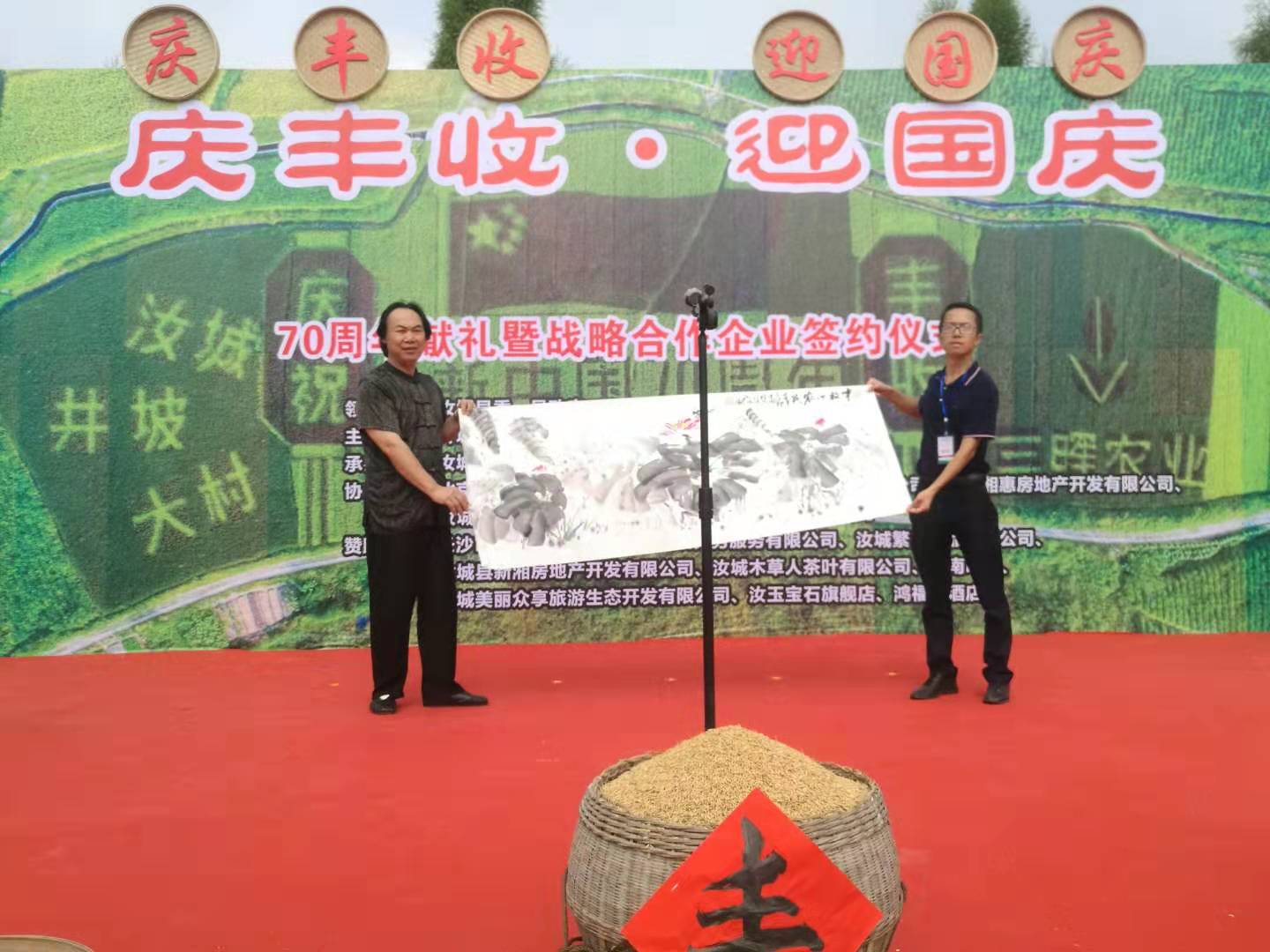 继去年汝城县举办首届“中国农民丰收节”活动后,9月15日,2019年中国(汝城)庆丰收?迎国庆农民丰收节暨汝城三晖农业开发有限公司战略合作签约仪式再次在湖南省汝城县井坡镇大村村举行。据了解,此次活动由汝城县人民政府主办,县农业农村局、井坡镇和汝城三晖农业开发有限公司承办,活动仪式得到了各级各部门的大力支持,农业部原副部长路明,湖南省人民政府原副省长、省人大常委会原副主任唐之享,国务院机关事务管理局原副局长周晋亮,巨型稻发明人、中科院亚热带农业生态研究所首席研究员夏新界博士,湖南省农业银行原巡视员丶省政府参事室研究员丶文史馆馆员曾昭才,中国国画院常务副院长丶共和国人民艺术家谢晓钢、郴州市人大原主任钟本强、郴州市人大副主任高爱国、郴州市人大原副主任黄诚等领导和嘉宾出席活动。