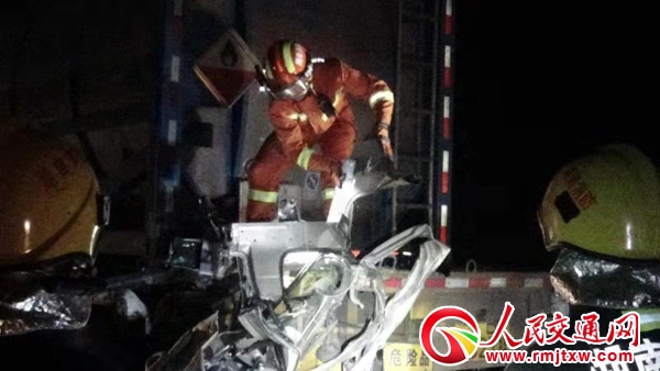 经了解,原来首先是一小车与运载黄磷的危化品车辆剐蹭追尾,危化品车后的小型客车避让不急,与危化品车又发生追尾;小型客车后的货车同样避让不急又与小型客车追尾。所幸的是运载黄磷的罐车罐体未破裂,只油箱破损,现场未起火。