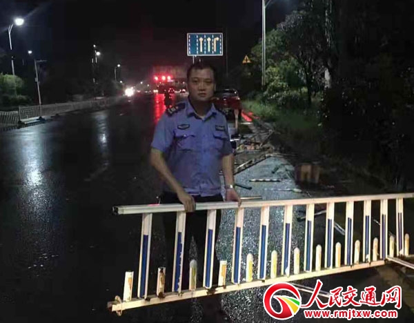 25日19时许,桂阳县交警大队事故值班人员接到指挥中心指令,称在S322线共和农场牛栏村路段发生一起交通事故。警情就是命令,雷振龙、邓海军等值班人员当即驾车赶往事发地点。不一会儿,透过挡风玻璃,远远看见事发地一大段隔离护栏被撞,七零八落的散落在路中央。此时,台风带来的暴雨倾盆而下,即使在路灯下能见度仍然很低,加上此路段车流量大,车速快,极易造成二次交通事故。雷振龙、邓海军等人立即把警车停在路边,顾不上豆大的雨滴打在身上,也顾不上路面积水漫过脚踝,摆放锥筒,设置好警戒线,把损坏的大段护栏抬离到路边安全地带,再把散落的小段护栏碎片一点一点的捡起来。半小时后,雨势减小,被撞毁的近百米隔离护栏终于清理干净,路面恢复了畅通。看着一辆辆过往车辆安全驶过,雷振龙、邓海军等人擦着满脸雨水,长长的出了口气。事后问他们为什么要当“环卫工”清理路面碎片,他们说,暴雨天气等环卫工赶来肯定太迟了,一块碎片就足以让车辆(特别是摩托车)发生意外事故,自己手脚累点没有什么,过往车辆安全我们就放心了!