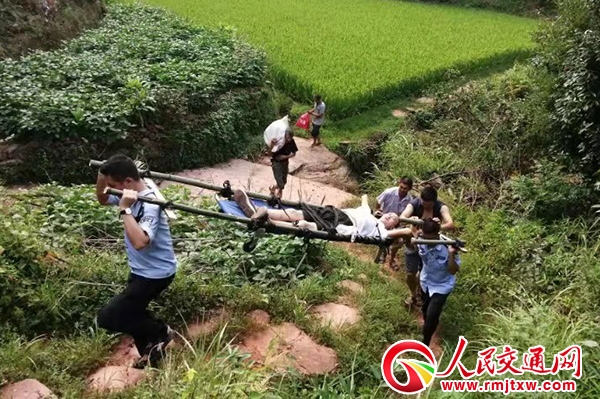 了解到该情况后,七甲坪派出所值班民警尹鹏带领驻村辅警全平马上驱车赶往黄大哥的住处,车子行至金河村委会后,民、辅警以及村干部徒步爬上700多米高山上来到黄大哥家中。考虑到情况紧急,黄大哥的病情一刻也不容耽误,大家来不及缓口气,立即找来竹子徒手制作了一副简易担架。他们将黄大哥抬上担架,冒着30多度的高温酷暑,在山间一步步地艰难行走着。他们的每一步都是在与时间赛跑,在经历了2个多小时的崎岖山路后,终于将黄大哥安全抬到了村委会。此时大家的衣服都已经湿透了,但是他们顾不上身体的疲惫与天气的炎热,又立即驾车将黄大哥送往了当地卫生院进行救治。