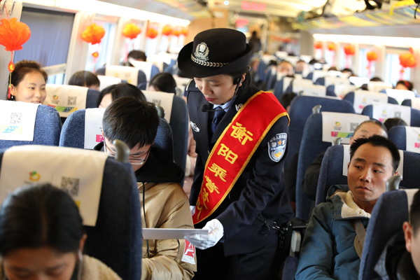 在踏上桂林北至长沙南的高铁列车后,青年民警给广大旅客拜个早年后,便开始对春运期间可能会遇到的各种警情进行详细而有趣的讲解。图文并茂的展板演示、自编自导的防盗顺口溜以及有奖问答赠送小礼品等丰富多彩的互动环节,拉近了警民之间的距离,旅客们纷纷点赞,不时地向青年民警拍照示意。