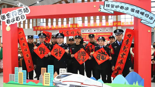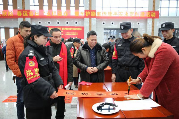 张家界西站去年12月26日通车运营后,该站派出所根据上级公安机关提出的“百万警进千万家”的部署,在春运前夕就进行策划,并协调张家界市永定区政法委、永定区文联、沙堤街道办事处和中建五局黔张常项目部等单位,在春运首日联合举办了这次宣传活动。