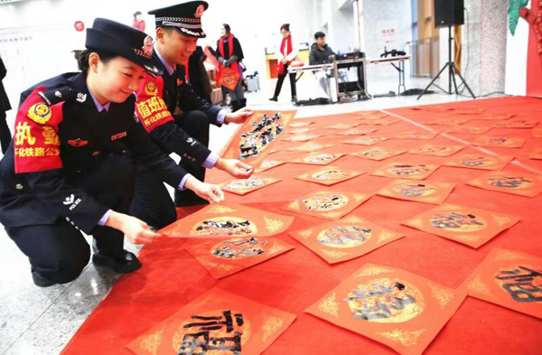 “五福迎春”唱平安的主题活动,以送福、揭福、拍福、贴福、唱福为主要内容。送福就是热情邀请了张家界市书法家协会的名家现场为旅客写福送福;揭福是组织旅客揭开“福字展板”上的红包,回答里面的铁路安全知识问题;拍福是由车站民警及工作人员与参加活动的旅客在“平安回家路”框内合影,营造“路地联防、警民连心、平安回家”氛围;贴福是为现场旅客发放“心愿贴”,由旅客自行写下心愿或祝福后贴上“福字展板”以表达自己回家旅途的心声;唱福即现场组织民警、工作人员及旅客群众大合唱,用歌声表达对祖国和家乡的热爱。