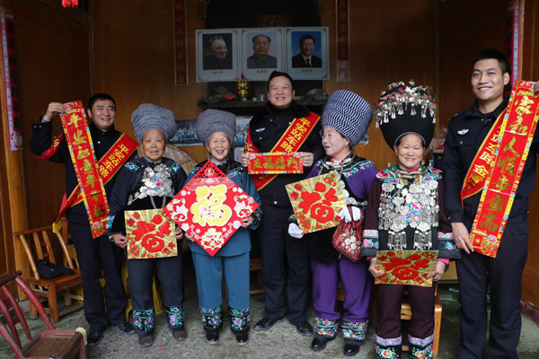 为推进“百万警进千万家”活动深入开展,努力打造“平安春运、有序春运、和谐春运”,1月11日,怀化铁路公安处松桃站派出所民警冒着寒风冻雨,翻山越岭来到地处偏僻的松桃苗族自治县沙坝河乡芭蕉湾苗寨,开展“福入苗寨 共筑平安”活动,为苗族群众送去新春的祝福。