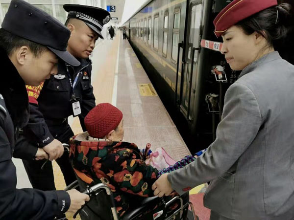 考虑到老人行动不便,行李又多,贵院明和王旭热心对老人进行关照,在列车进站后,主动推起老人的轮椅,将她送上了列车,并向列车工作人员说明老人的情况,希望一路给予帮助。临别时,老人激动地竖起大拇指对两位民警连声夸赞:“你们都是好警察!”
