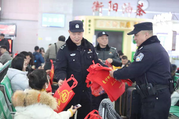 1月14日,衡阳东站派出所开展“温馨春运 铁警伴您平安出行”主题党日活动,30余名党、团员民警在所支部带领下,走进候车室,为旅客提供开水、咖啡等热饮 ,发放“平安出行小知识”、“铁警温馨提示”宣传资料,并送上红灯笼、春联、福贴等春节喜庆物品。寒冷冬日,侯车室的气氛温暖而热烈,受到广大旅客一致好评。