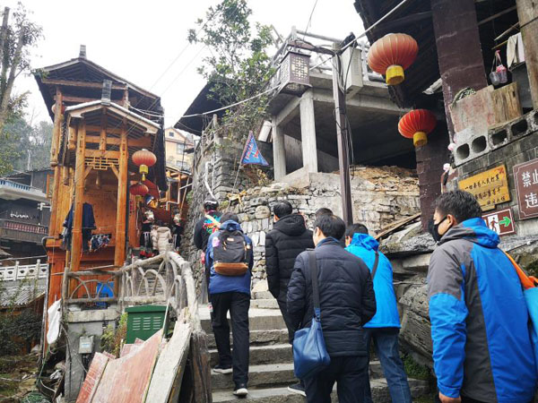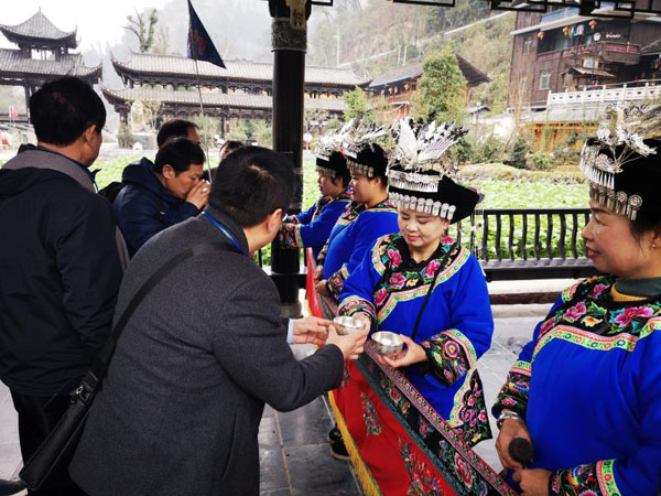 元月14日,在湖南湘西古丈县默戎镇墨戎景区迎来一批批游客,他们在景区导游的带领下,感受苗家人的热情好客的同时,领略苗家民俗风情。由于当地政府支持鼓励农村青年回家创业,景区导游、农家乐都是本村青年农民二次择业创业的结果,带动了当地经济,促进了本地旅游发展。