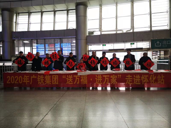 元月15日下午15时,室外下着小雨,寒风刺骨,但在湖南怀化火车站候车室却出现温馨温暖的一幕。怀铁老年书法家协会的18名书法家们开展2020年广铁集团“送万福.进万家”走进怀化站话动,为旅客挥毫泼墨,写出各种形体的福字和春联,并送上新年的祝福。旅客们说道:感谢铁路书法家们为我们送福、送春联,我们带着平安和福回家!
