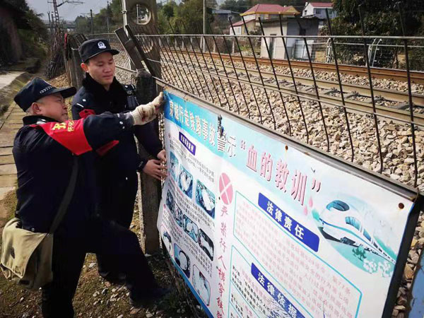 沪昆铁路是国家`双线电气化铁路,平均每5分钟就有一趟客货列车道过,是我国第二条运输繁忙的主干线。为了确保节前大动脉的畅通,元月16日,位于沪昆铁路线上的湖南怀化铁路公安处芷江西站派出所组织民警在管内沪昆铁路线上对重点区段的重点设施进行安全检查和维护,并同时走村入户进行安全宣传,确保节前铁路运输安全。