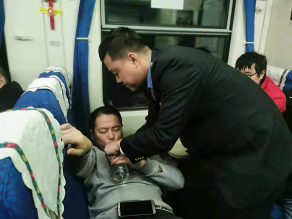 列车长让病人改为平躺姿势,并帮助患者服下救心丸,并安抚患者不要担心,好好休息。20分钟后,患者病情明显缓解,情况稳定。