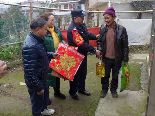 1月19日上午,慈利所民警王旭、周平、熊玉林提着沉甸甸的慰问物资和春联,带着新年祝福来到特困户杜爷爷家。