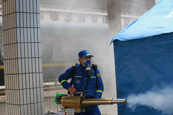 二月七日下午1点30分,在湖南怀化靖州火车站侯车室、站台、售票厅、防疫临时账篷前,有三名身穿蓝色制服,头戴防护面具,手持喷雾枪的男子忙碌的身影,原来他们在对上述公共场所进行防疫消毒。这些男子来自靖州蓝天救援队(筹备组、公益组织),今天,他们为了疫情防控工作的需要,自愿来火车站开展义务消毒工作。这三台设备和消毒药是他们队员自筹一万元资金昨天连夜从娄底市双峰县采购来的。他们在靖州汽车站、火车站、飞山新城居民小区、鑫汇中央广场等公共场所进行了防疫消毒,确保公共场所卫生安全,他们的义举受到旅客群众的称赞!据负责的小颜说:“他们要把义务消毒工作坚持下去,保护自己、保护家人、保护家乡”!(王利君 丁勇)