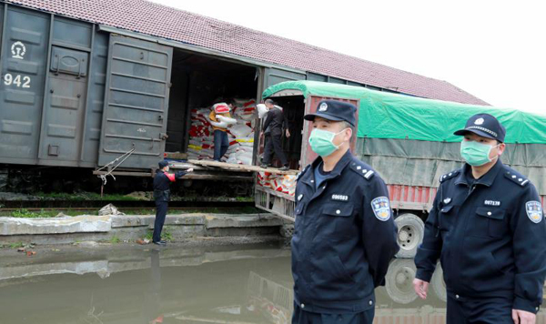 2月18日,湖南靖州火车站到达一趟粮运专列,该处民警在货场向卸载负责人进行作业安全和疫情防护宣传。连日来,湖南怀化铁路公安处对管内到达粮运专列进行安全巡查,确保粮食运输安全。(丁勇 葛云龙)