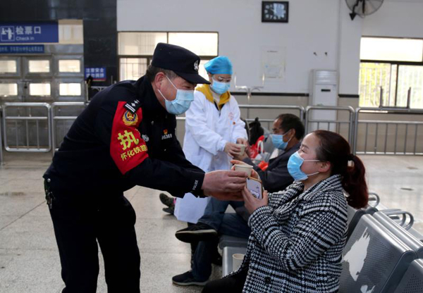 2月26日,在湖南怀化靖州火车站候车室民警和医务人员为复工的候车旅客送上抗新冠肺炎病毒中药茶。连日来,随着企业陆续复工,当地务工人员陆续踏上返程路,为了确保他们平安出行,靖州站派出所民警和县中医院工作人员为候车旅客每天送上二桶热气腾腾的中药茶,让广大出行旅客增强免疫力,预防疾病发生。(周梓颐 丁勇)