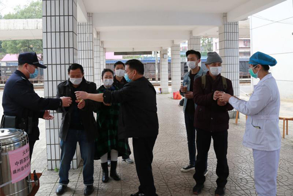 2月29日,在湖南怀化靖州火车站出站口防疫防控点,医务人员孙军秀为民警刘柯送上中药茶。