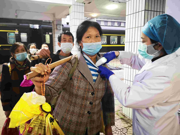 连日来随着许多企业复工复产,外出务工人员陆续返程。湖南怀化靖州县中医院在火车站防疫防控点为旅客进行防疫安全宣传,并同时送上中药茶,为部分旅客纠正口罩正确戴法,确保广大旅客健康平安出行。(丁勇)