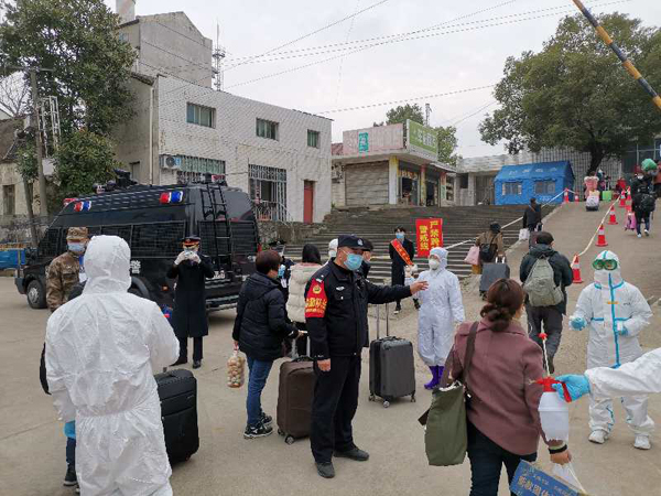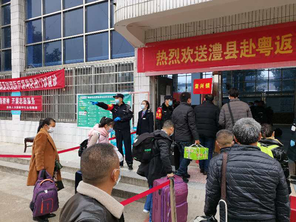 当务工人员统一到达澧县站后,各单位分工合作,在车站广场入口首先由医护人员负责对务工人员做好体温测量健康筛查工作,随后由石门站派出所民警与车站客运人员引导民工分批次有序进站乘车,在此期间,民警着重加强了对乘车旅客随身携带酒精消毒液的检查,坚决防止旅客将危险品带上火车。