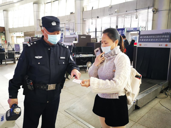 连日来,湖南怀化铁路公安处怀化车站派出所民警在做好科学防疫的同时与车站为老弱病残重点旅客进行重点服务开辟绿色通道,并立足岗位为出行旅客服务。图为4月1日,怀化火车站派出所民警为进行旅客服务。(丁勇 刘肖辉 黄心叶)