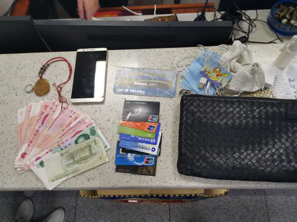 原来5月9日下午14时许,长沙火车南站派出所值勤民警邓日波在长沙火车南站西进站安检口巡查时,发现安检仪上有一个无人认领的黑色手包。为了找到失主的信息,邓日波在处置台与长沙南站安检队员一同打开了手包,发现包内有:华为手机1台、价值不菲的钻戒和玉观音吊坠各1枚,现金3000余元以及银行卡、消费卡若干。为了尽快找到失主,民警拿着手包到检票口、安检口等地到处询问,并通过车站广播反复播出失物招领,但一直没有人前来认领。过了3个多小时后,看到还是没有找到手包的主人,民警准备通过其他渠道信息找到失主的联系方式时,当日17时52分,对讲机里传来值勤队长骆帅杰有无捡到一个黑色手包的询问。原来,有一位旅客因在长沙南站候车时遗失了黑色手包打电话到长沙南站公安值勤室求助。