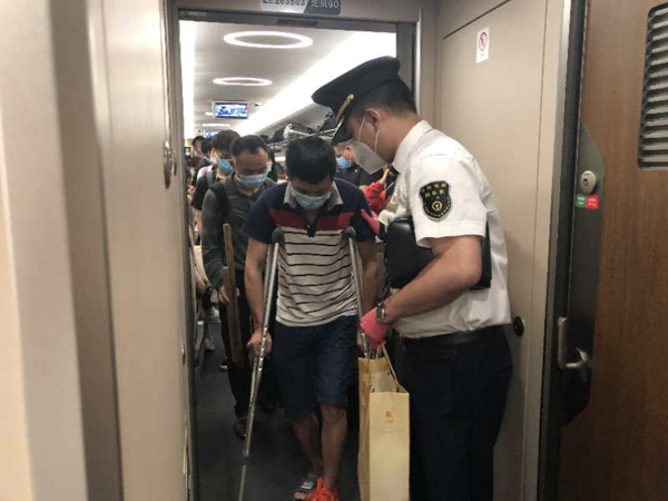 列车达到长沙南站前,杨皓车长早已联系好了轮椅。车一到站,他一路小跑将车站送来的轮椅带到指定车门口,并一手拎起苏先生的行李,一手小心搀扶其坐上轮椅,直到目送其安全远离车厢。