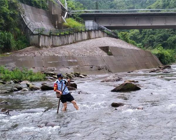 隐患排查中,因雨后溪水上涨,导致路面难以通行,59岁的老民警刘建文见此场景,二话不说脱掉鞋子带头走过小溪,溪水漫过了膝盖,其他人也纷纷脱鞋趟过小溪。民警们正是以坚韧不拔的顽强品质,克服恶劣天气的影响,用敬业守护好铁路平安。