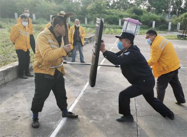 “持棍或者持叉的配手要站在持盾手的侧后,利用盾牌的掩护,积极地寻找时机,主动地去击打或者叉住暴恐分子,合力控制住暴恐人分子。”民警讲解完后,随后组织职工进行实景模拟演练。