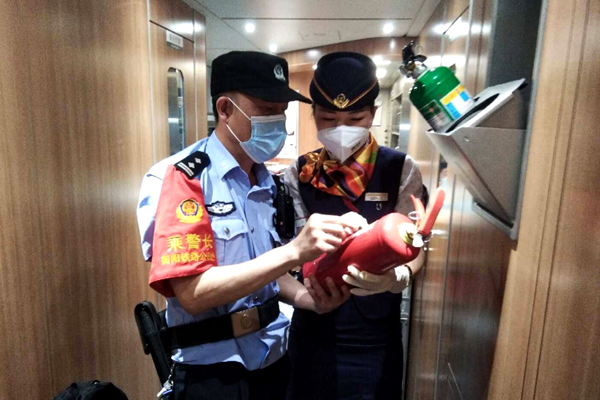 为保障旅客列车消防安全,乘警支队组织全体乘警开展列车消防安全大检查,由列车长牵头,乘警督促、检查、指导,重点对列车“二炉一灶一电”、灭火器、安全锤等进行全面检查,并开展了消防安全知识宣传。