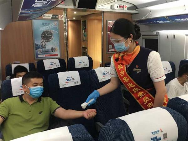 2020年7月1日,正值中国共产党建党99周年,长沙客运段高铁动车一队在七一建党来临之际,长沙客运段动车一队的高铁乘务党支部班组,利用折返作业间隙组织党员和入党积极分子学习《党章》知识,并结合当下列车疫情防控和列车服务工作,在“复兴号”高铁列车上开展“党员志愿者服务旅客”主题党日活动。志愿者服务工作得到了广大旅客们的称赞。