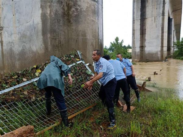 8日8时许,岳阳东所坦渡警务区警长张恩克带领保安巡线时,发现京广高铁K1375+500M处金堂湾大桥下7片防护网倒塌。经过详细检查,由于雨水夹杂泥沙和树枝不断冲击,防护网底部堵塞较多杂物,水势较大冲毁护网。张恩克和保安逐一扶正并临时固定护网,安排保安值守及时清除杂物,并通知铁路部门修复。