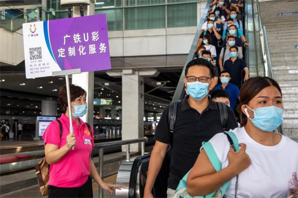 同时,为了让旅客出行更顺畅、更安心,广州南站还为该定制团队设置了专用候车区,安排专人引导旅客测温、候车、进站、上车,并耐心为他们讲解登乘列车注意事项,提醒旅客提高个人安全防范意识,尽最大努力降低疫情传播风险。