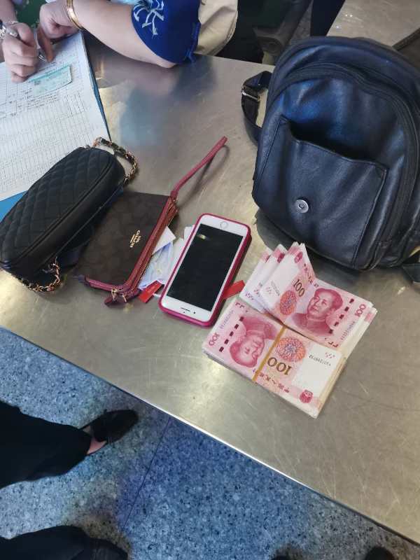 就在同一日20时许,长沙南站派出所值勤三大队民警在进站安检口巡视时,在安检机旁发现了一个黑色挎包无人认领,包内有9700元现金、一台苹果手机以及车票等物品。民警凭包内一张车票信息联系车站广播室进行广播寻人,失主张女士听到广播才察觉挎包遗失。