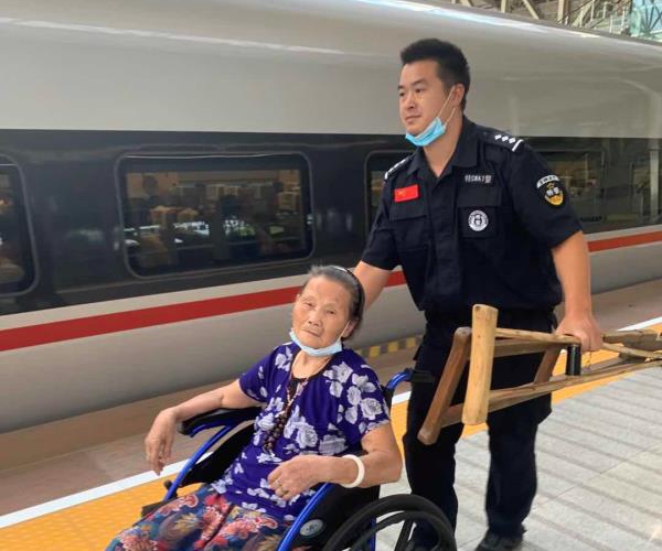 老人抖动着嘴唇,连说谢谢,身边的妇女也一个劲感激。征得老人和妇女同意,陈林斌在同事何期业的协同下,将老人背在背上,由于赶车时间紧迫,电梯旅客众多,陈林斌索性一步两个台阶跨上步梯,将老人从负二楼背至一楼进站口,过了安检,又将老人背到座位上。同事何期业也没闲着,一手扛起老人的轮椅,一手拎着老人出行的包裹,送上车。