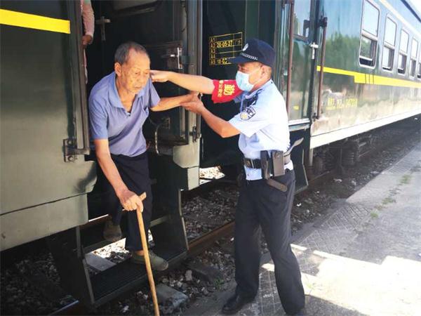 8月29日,当旅客列车在靖州站停站时,几位民警正在为下车的老弱旅客提供帮助。这是由怀化铁路公安处靖州站派民警组成的爱民“帮帮队”,在服务重点旅客。