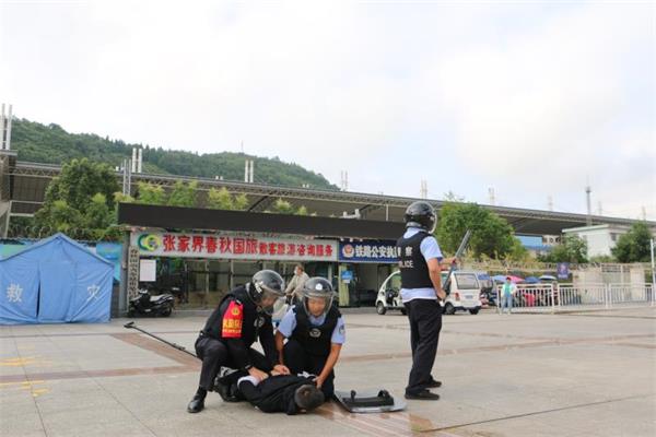 为提升张家界站区反恐处突能力水平,保障辖区群众生命财产安全,张家界站派出所根据上级关于全警实战大练兵工作部署安排,组织民警联合张家界车站职工在张家界站出站口开展刀斧砍杀模拟处置演练。