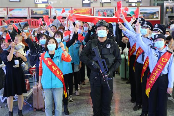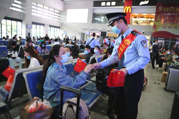 上午10点10分,活动组织者宣布:明天就是新中国成立71周年的纪念日,让我们以良好的姿态向伟大的祖国报告工作。现场的值勤民警、特警队员与青年志愿者们,先后举行了岗前宣誓和向国旗敬礼仪式。之后,大家豪情满怀,手拿红色的小国旗分发给候车的旅客们。一声声节日的问候,一遍遍平安的祝福,营造了温馨的旅途氛围。