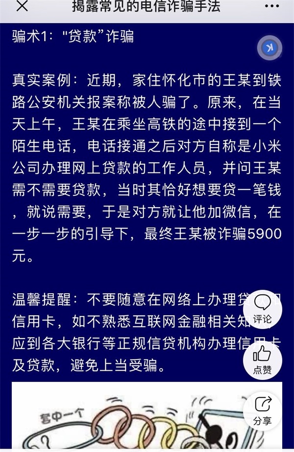 “近年来,电信诈骗的手法不断翻新,众多百姓深陷被骗的陷进。我处内保支队编发的防电信诈骗的美篇,可以对大家提个醒,也请您转发提示更多的人群,谨防上当受骗。”这段文字,是广州铁路公安局怀化铁路公安处处长郭纯发的朋友圈,在这段充满温馨的文字下面,链接着该公安处内保支队编辑发表的《美篇·揭露常见的电信诈骗手法》的防骗宝典。