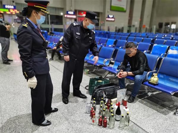 10月22日21时20分左右,怀化铁路公安处石门站派出执勤民警接到客运值班员电话称:一名醉酒男子欲强行携带白酒进站乘车。接报后,民警迅速赶赴现场发现:该男子浑身酒气,口齿不清,且站立不稳。经过检查该男子随身携带的行李,发现他共携带了24斤22瓶不同种类的白酒。随后,民警和车站工作人员耐心向该男子进行解释,根据最新修订的《铁路进站乘车禁止和限制携带物品目录》规定:“散装白酒不能带上火车,可以最多携带未开封的瓶装白酒6瓶,如果白酒度数高于50度以上则上限为2瓶。”