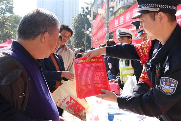 为确保辖区治安稳定,按照“齐抓共管、群防群治、协同整治”的要求,全面构建立体化治安综合治理防控体系,11月9日,松桃站所联合秀山县政法委、秀山县民族宗教委、秀山县交通局、成都局集团有限公司涪陵工务段在秀山县花灯广场“摆地摊”,开展“送法到万家”宣传活动。